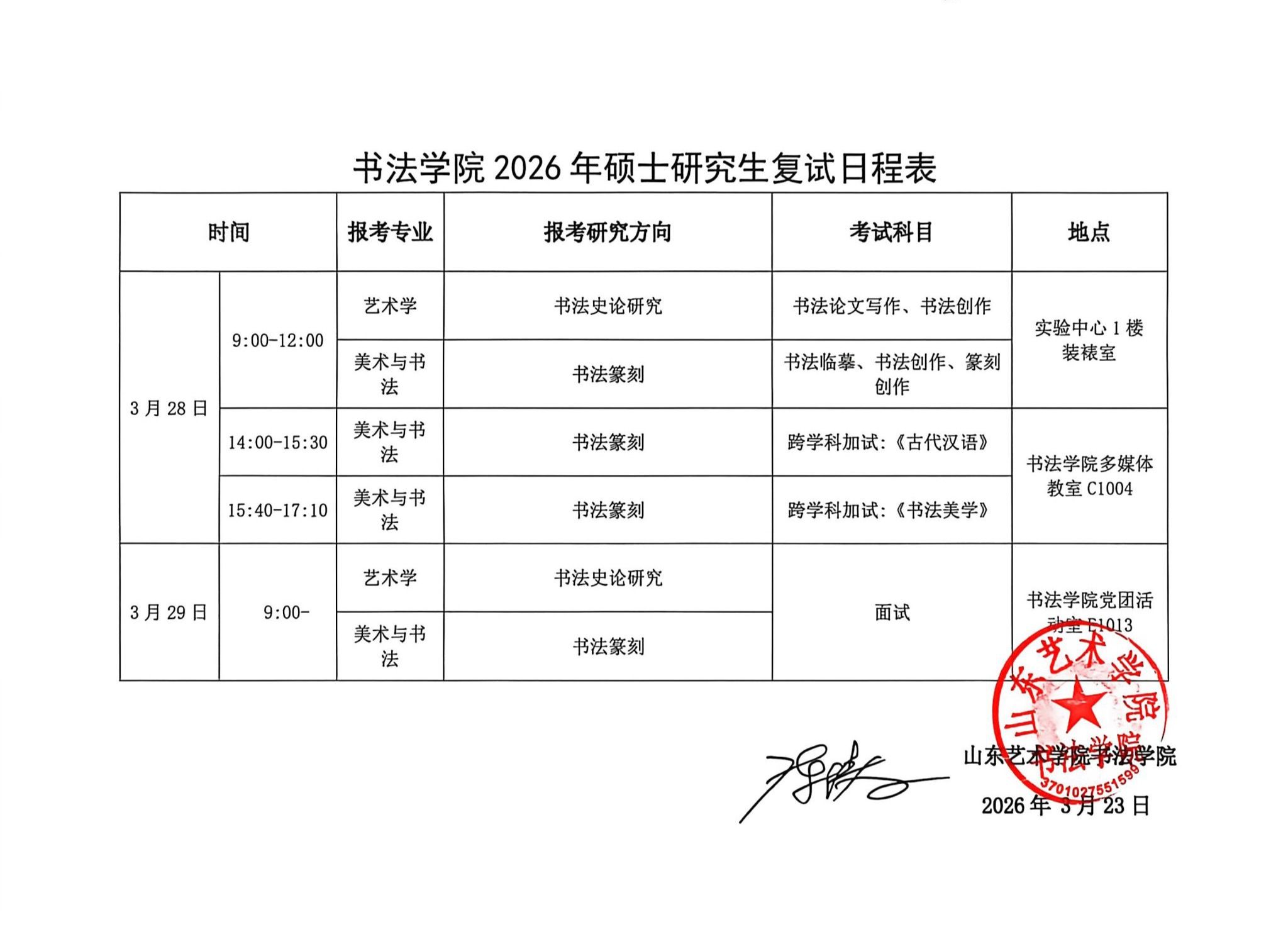 书法学院2026年硕士研究生复试日程表