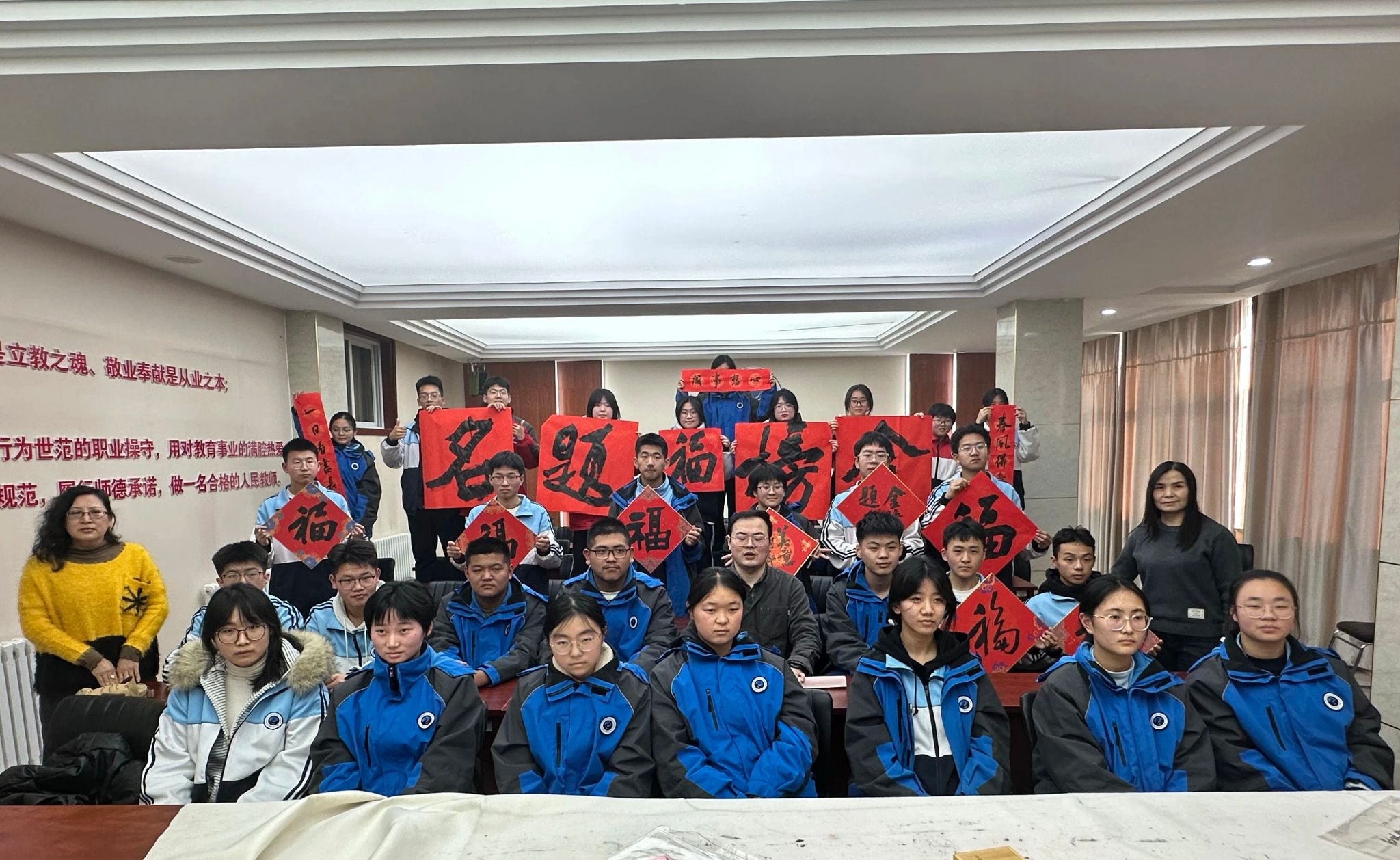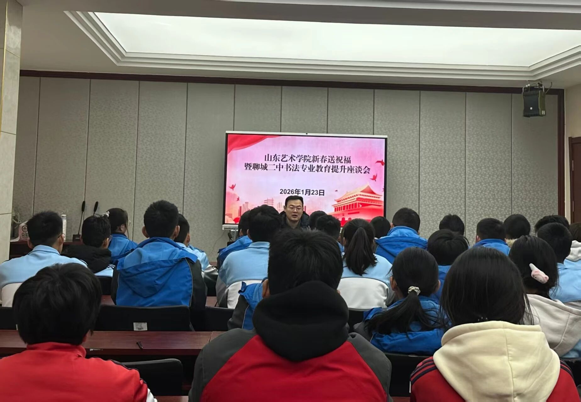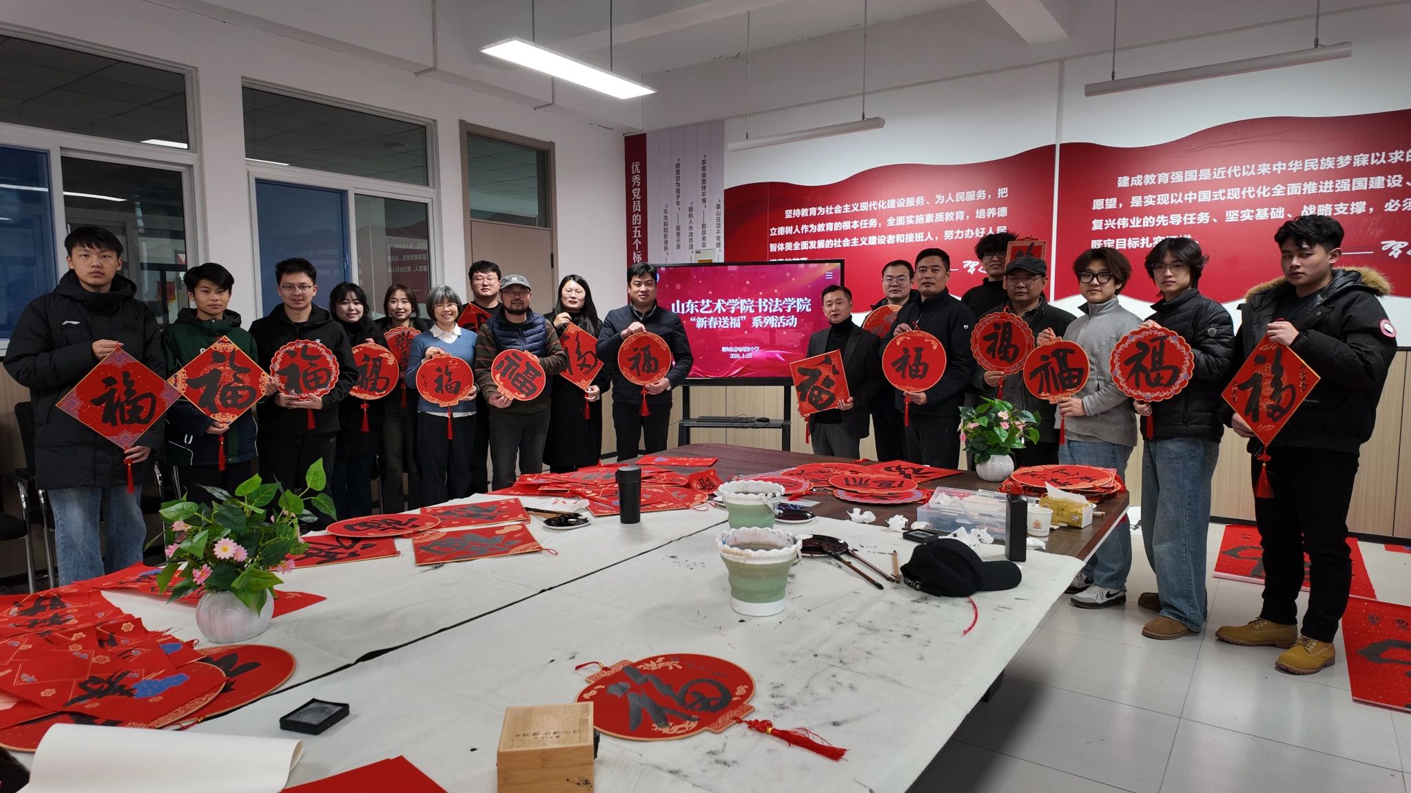 1月23日,书法学院党总支组织师生代表赴聊城开展“岁末迎新春 翰墨寄深情”新春文化实践活动,先后走进山东天工岩土工程设备有限公司、聊城第二中学、聊城运河高级中学送出春联福字100余副。