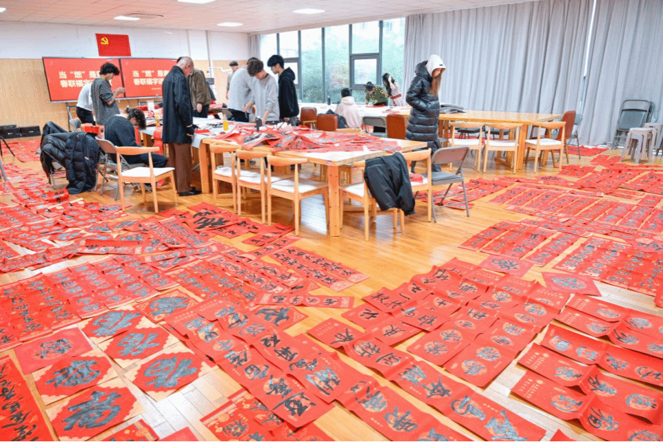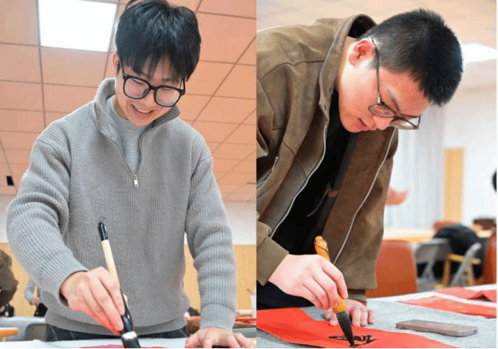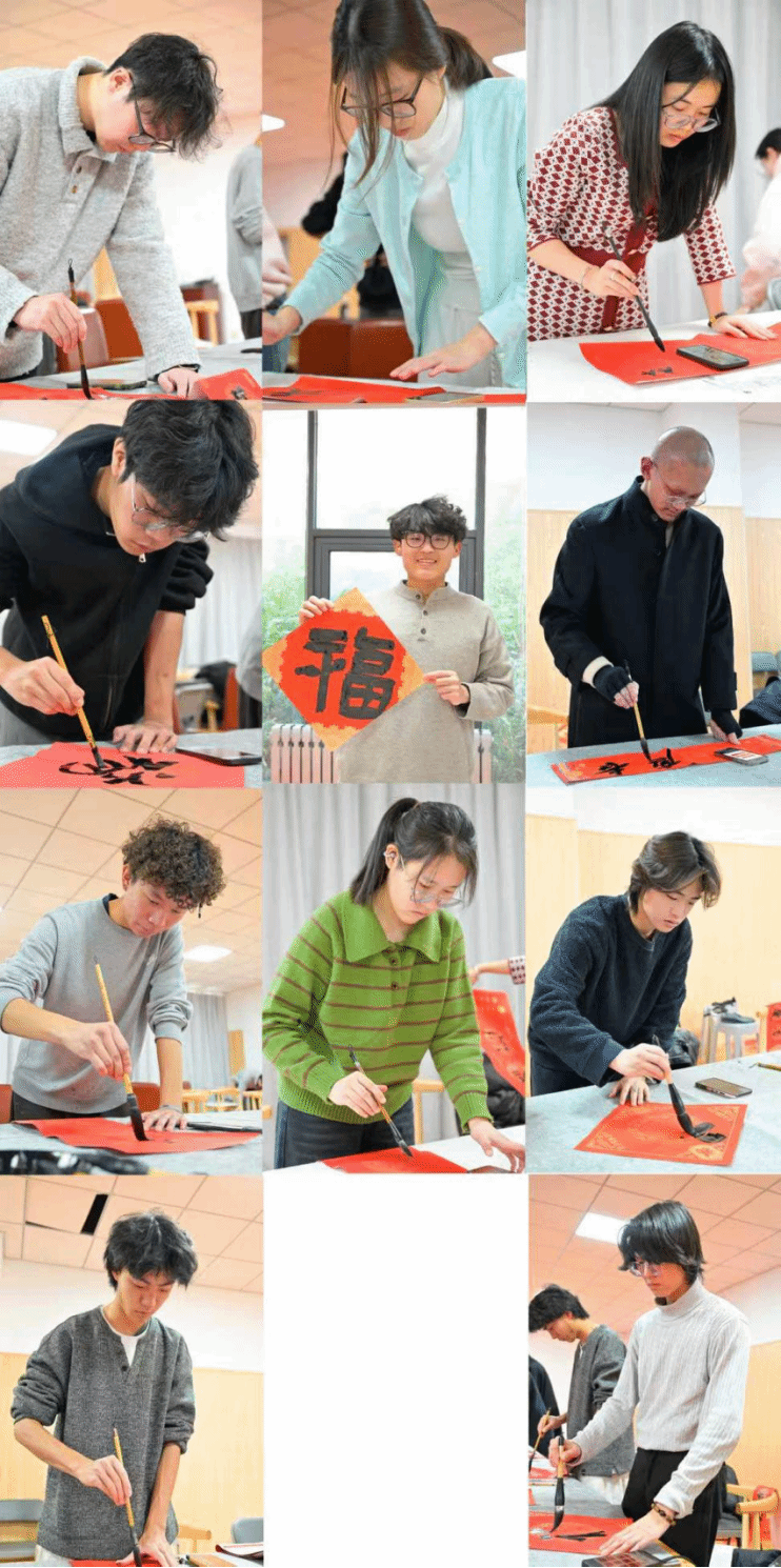 活动兼具传统底蕴与青春活力。活动现场,在老师的专业点拨下,同学们饱蘸浓墨尽情挥洒、凝神静气勾勒笔画、相互协作研墨牵纸,默契十足。楷书的端庄典雅、行书的灵动飞扬、隶书的古朴厚重,一幅幅笔力遒劲的作品陆续诞生,方寸之间尽显功力与巧思。创作中,师生们坚守传统,书写“一元复始呈兴旺,万象更新启泰康” 等经典联语,大家边创作边交流技法、品评佳作,现场既洋溢着节日的喜庆氛围,又饱含浓厚的学习研讨气息,成为一场兼具专业实践与文化雅集特质的特色活动。