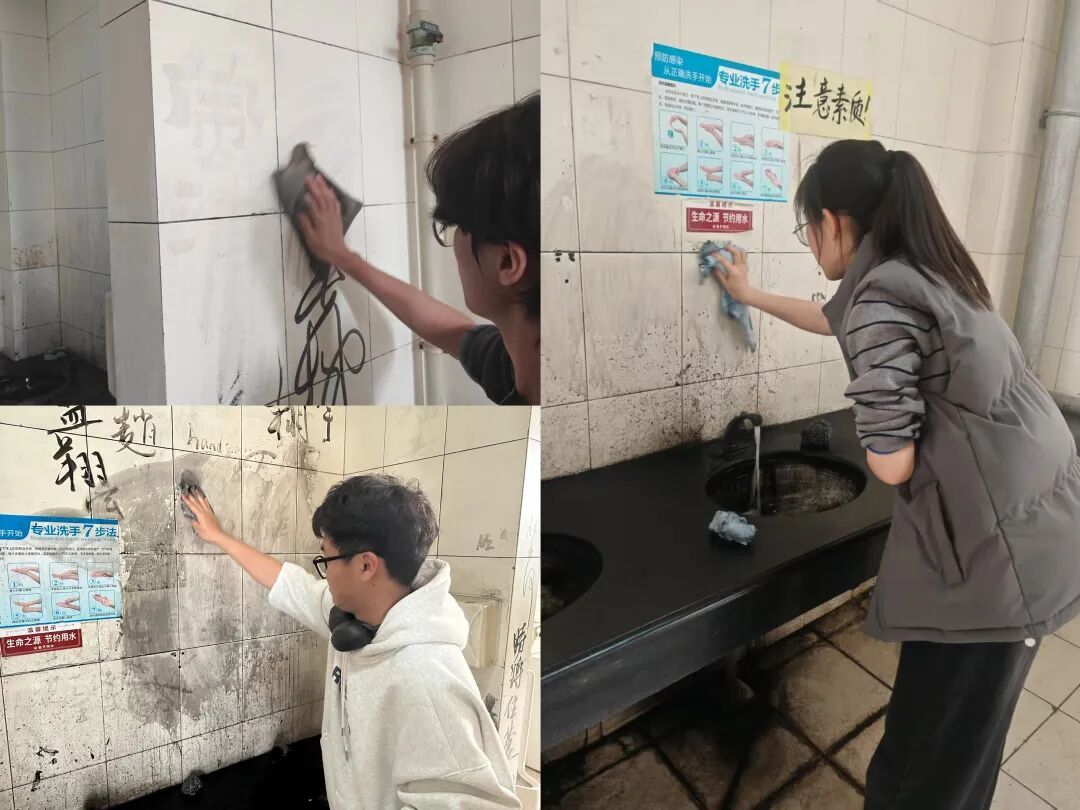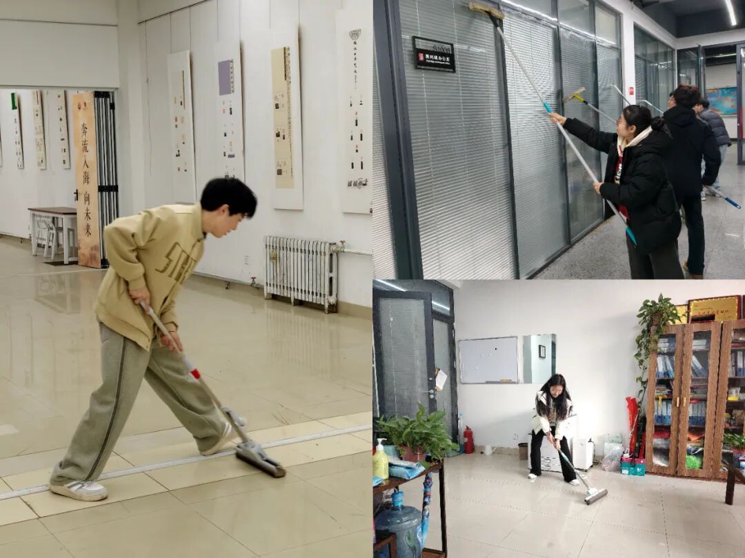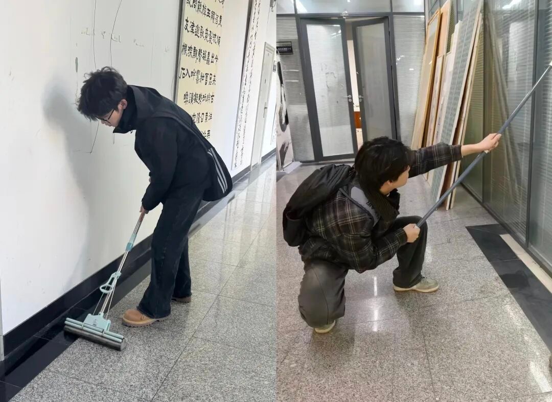 活动期间,志愿者们重点对办公室、展厅、卫生间等区域开展全面清洁。办公区域内,大家有序扫地、擦桌、整理杂物,办公环境迅速焕然一新;展厅区域,志愿者细致擦拭玻璃、清理百印墙积尘,展厅面貌整洁有序;卫生间区域,针对清洗文房用具形成的墨渍污垢,志愿者戴手套,用钢丝球、抹布及洗洁精反复擦拭缝隙与墙面,顽固墨渍被彻底清除,空间恢复洁净明亮。